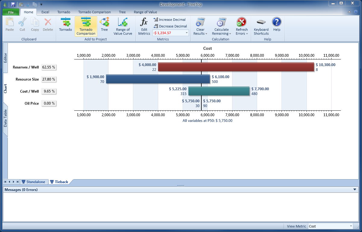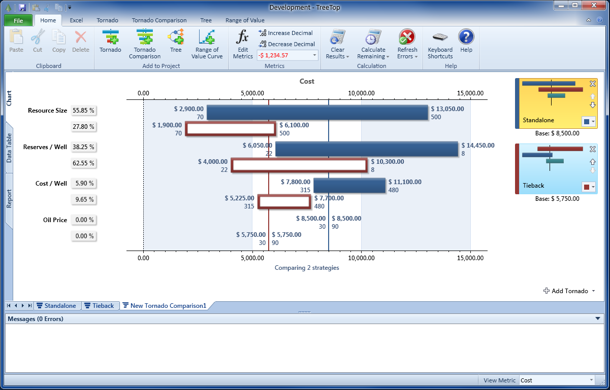 The screenshot below shows a TreeTop project with two Tornado Diagrams, one for a Tieback strategy, and another for a Standalone strategy.